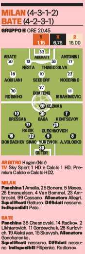 MILAN BATE BORISOV PROBABILI FORMAZIONI – Probabile riposo per Antonio Cassano in vista del match di domani sera fra il Milan e il Bate Borisov, valevole per il terzo turno dei Gironi della Champions League. Il fantasista barese dovrebbe lasciare posto a Boateng e Robinho in un tridente con Ibrahimovic. Darà forfeit anche Thiago Silva, sia per il recente acciacco, sia per rifiatare. Al suo posto dovrebbe giocare Yepes con Mexes pronto a subentrare nella ripresa. Di seguito le probabili formazioni del match a cura de La Gazzetta dello Sport.