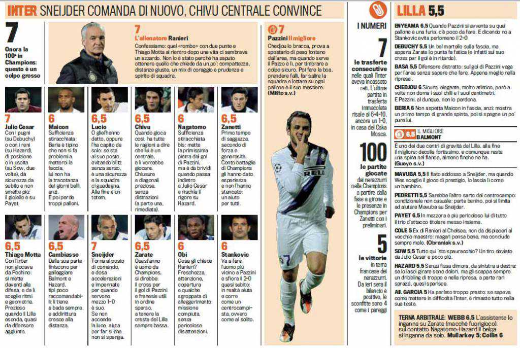LILLE-INTER VOTI PAGELLE – Di seguito trovate i voti e le pagelle de La Gazzetta dello Sport relativi alla sfida di Champions League fra Lille e Inter. Spicca la prova di Wesley Sneijder, al ritorno dopo l’infortunio, nonchè di Pazzini, l’autore della rete che è valsa i tre punti.