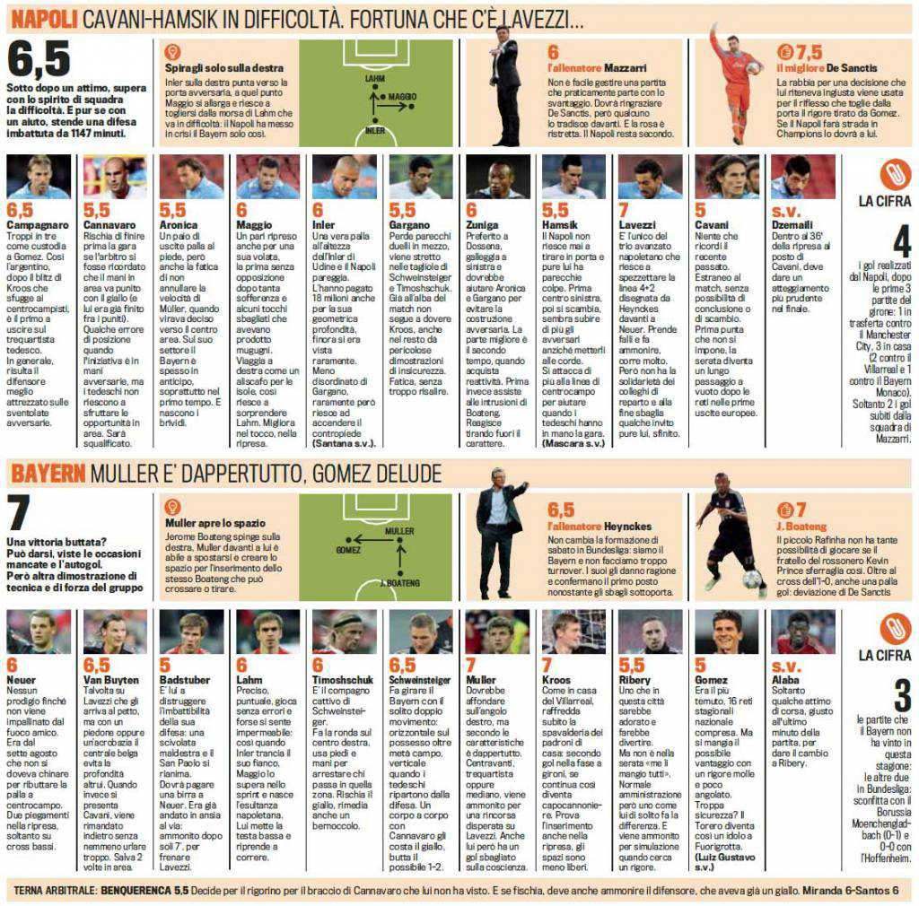 NAPOLI BAYERN MONACO VOTI E PAGELLE – Vi presentiamo i voti e le pagelle di Napoli Bayern Monaco targati Gazzetta dello Sport. Il match giocatosi ieri sera allo stadio San Paolo è terminato con il risultato di parità, 1 a 1, grazie alla rete di Kroos per i tedeschi e all’autorete di Badstuber.