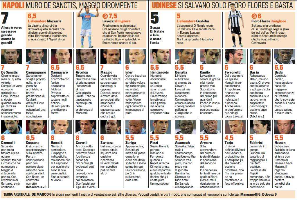 NAPOLI UDINESE VOTI PAGELLE – La Gazzetta dello Sport premia Lavezzi, il migliore per la Rosa nella sfida fra Napoli e Udinese giocata ieri sera e vinta dagli azzurri per 2 a 0. Il Pocho è tornato in rete al San Paolo dopo un lunghissimo digiuno. Di seguito i voti e le pagelle complete del match.