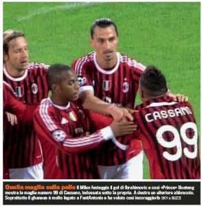 BATE BORISOV MILAN ESULTANZA CASSANO – Era a Minsk il Milan ma il pensiero era a Milano, al Policlinico, dove è ricoverato attualmente Antonio Cassano. E i giocatori hanno voluto ricordare il fantasista barese in occasione del gol di Ibrahimovic. Bellissimo il gesto di Boateng che per tutta la partita ha indossato due casacche, la sua, e sotto quella di Cassano. Al momento della rete il ghanese ha alzato la propria maglietta svelando il 99 del barese. Di seguito la foto presa da La Gazzetta dello Sport.