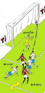 MILAN-CATANIA, LA VIGNETTA – Nell’11° giornata di serie A , I rossoneri di Mr Allegri confermano l’ottimo momento vincendo il 5° match nelle ultime cinque gare e lo fanno anche convincendo contro un Catania che arrivava al San siro forte di 6 risultati utili consecutivi.Contro gli etnei segnano Ibrahimovic su rigore al 7°, Robinho al 24°,nella ripresa l’autorete di Lodi porta a tre le marcature e quasi in chiusura Zambrotta al 72° fissa il poker sul 4-0.Il 2° gol di Robinho merita di essere descritto in vignetta perchè avviene dopo un’ottima imbeccata da centocampo di Ibra che serve Il brasiliano il quale in dribbling si beve letteralmente Bellusci per poi insaccare in rete sul palo più lontano alla sinistra di Andujar.