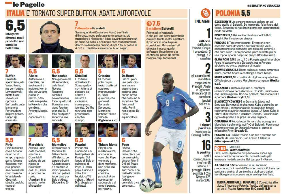 POLONIA ITALIA VOTI PAGELLE GAZZETTA – Di seguito trovate i voti e le pagelle della sfida fra Polonia e Italia firmati da La Gazzetta dello Sport. Ottima prova di Mario Balotelli autore di un gol di rara fattura. Bene anche Ignazio Abate, alla prima in azzurro, che si conferma uno dei migliori terzini destra d’Italia.