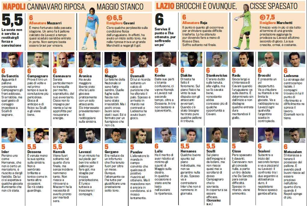 NAPOLI LAZIO VOTI PAGELLE – Di seguito i voti e le pagelle firmati Gazzetta dello Sport relativi alla sfida fra Napoli e Lazio. Il match del San Paolo si è concluso con il risultato di 0 a 0. Il migliore in campo è stato il portiere capitolino Marchetti premiato con un bel 7,5.
