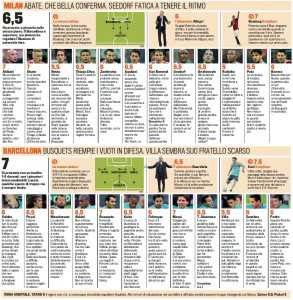 MILAN BARCELLONA VOTI PAGELLE GAZZETTA – Di seguito i voti e le pagelle della Gazzetta dello Sport relativi alla sfida fra Milan e Barcellona conclusasi con il risultato di 3 a 2 in favore dei blaugrana. Prova generosa del Milan che però non riesce a superare gli invicibili. Sontuosa la prestazione di Xavi, fra i rossoneri si distingue invece Boateng autore di una vera e propria perla.