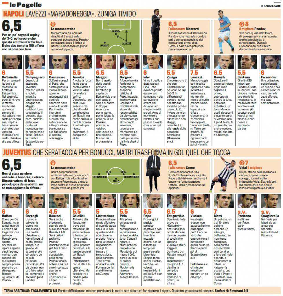 NAPOLI JUVENTUS VOTI PAGELLE – Di seguito trovate i voti e le pagelle firmati Gazzetta dello Sport della sfida fra Napoli e Juventus spettacolare gara del San Paolo conclusasi in parità, 3 a 3. Grande prova di Goran Pandev, il migliore in assoluto del match, autore di una splendida doppietta, le prime due reti ufficiali con la casacca dei partenopei. Dalla sponda bianconera ennesima prestazione super di Simone Pepe, autore della rete che ha permesso ai suoi di agguantare il pareggio. Ottima la partita anche di Matri e Lavezzi mentre male Bonucci e Lichtsteinter.
