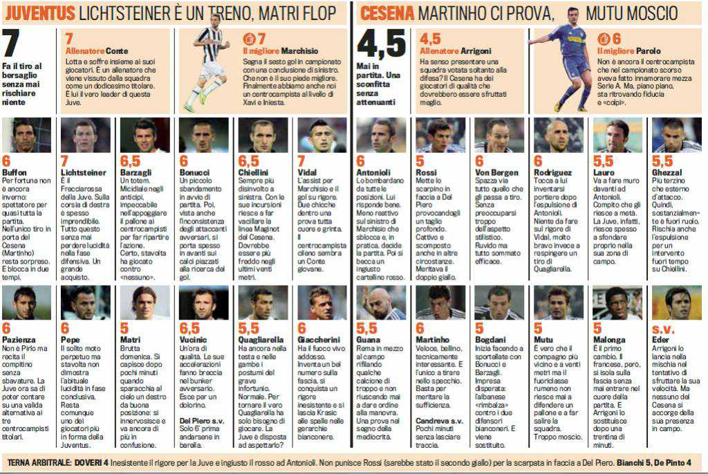 JUVENTUS CESENA VOTI PAGELLE – Di seguito trovate i voti e le pagelle della sfida fra Juventus e Cesena, firmati Gazzetta dello Sport. I bianconeri superano fra le mura domestiche dello Juventus Stadium grazie al solito Marchisio, capocannoniere della squadra e migliore in campo anche ieri. Per lui sesto gol in campionato come mai era accaduto prima. Ottima la prova anche di Lichtsteiner e di Vidal, due dei nuovi arrivati, mentre male Matri, stranamente spento. Nei romagnoli migliore in campo è Parolo (voto 6). Delude invece Mutu, il grande ex dell’incontro.