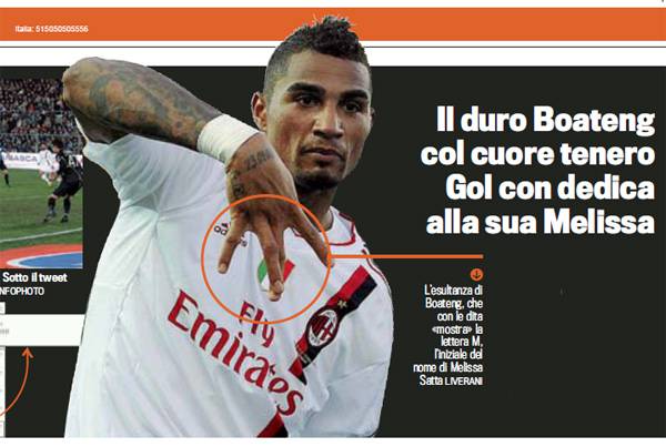 ATALANTA MILAN – Continua l’amore fra Kevin Prince Boateng, centrocampista del Milan, e la bella shwogirl Melissa Satta, valletta di Kalispera. I due hanno passato il capodanno assieme, a Dubai, e ieri il rossonero ha voluto mandare l’ennesimo messaggio d’amore alla sua fidanzata. Dopo aver realizzato il gol del 2 a 0 con l’Atalanta si è avvicinato alle telecamere facendo il segno della “M”, l’iniziale di Melissa, con le quattro dita rivolte in basso. Sicuramente un gesto d’affetto che pensiamo abbia fatto molto piacere alla Satta.
