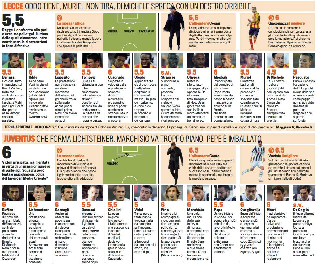 LECCE JUVENTUS VOTI PAGELLE – Di seguito trovate i voti e le pagelle di Lecce-Juventus firmati Gazzetta dello Sport. I bianconeri ottengono i tre punti grazie al gol di Alessandro Matri che ha sbloccato una gara un po’ complicata. Migliore dell’incontro risulta essere Mirko Vucinic, una spina per la retroguardia salentina. Resto della compagine bianconera, invece, sottotono, al di fuori di Lichtsteiner, al pari del montenegrino, reduce da una buona prestazione. Fra le fila dei giallorossi bene il capitano Giacomazzi, resosi pericoloso in diverse occasioni.