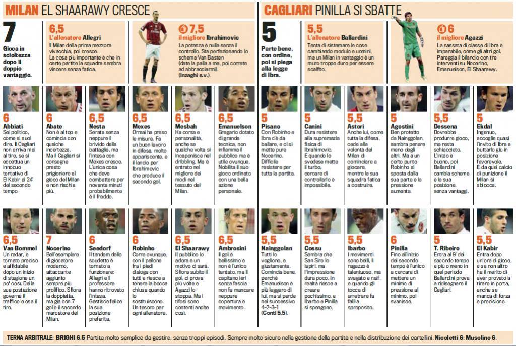 MILAN CAGLIARI VOTI PAGELLE GAZZETTA – Di seguito trovate i voti e le pagelle di Milan-Cagliari firmati Gazzetta dello Sport. Stupenda prestazione, tanto per cambiare, di Zlatan Ibrahimovic, autore di una rete su punizione e di un assist al bacio per Nocerino. Ottima prova anche del numero 22 rossonero, all’ennesima rete stagione e sempre più uomo chiave dei campioni d’Italia in carica. Bene anche Mesbah, alla prima in campionato, nonchè Emanuelson e Ambrosini, quest’ultimo, autore della terza rete che ha chiuso il match.