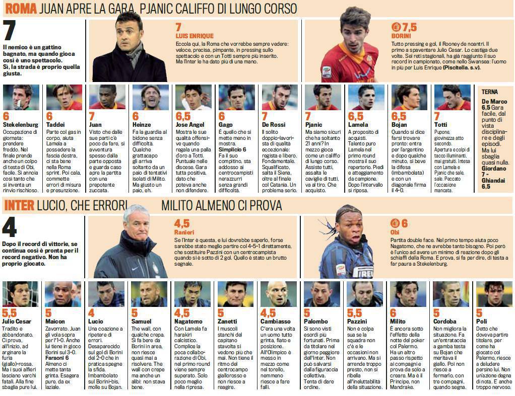 ROMA INTER VOTI E PAGELLE – Di seguito trovate i voti e le pagelle di Roma-Inter firmati Gazzetta dello Sport. La sfida in programma ieri pomeriggio all’Olimpico di Roma si è conclusa con il risultato netto di 4 reti a zero in favore dei giallorossi. Un match davvero disastroso per i nerazzurri “premiati” dalla Rosea con un 4 in pagella di media. Si salva il solo Obi, l’unico che cerca di fare qualcosa, e Diego Milito, che ha confermato l’ottimo momento di forma. Il peggiore in campo in assoluto risulta essere Lucio, colpevole di una serie di errori quasi infinita.