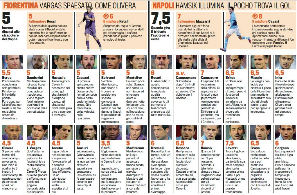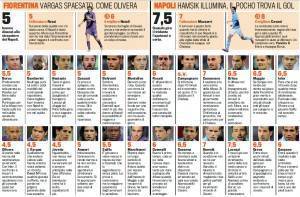 FIORENTINA NAPOLI VOTI PAGELLE GAZZETTA – Più in basso potete trovare i voti e le pagelle di Fiorentina-Napoli firmati Gazzetta dello Sport. La gara, giocatasi ieri sera allo stadio Artemio Franchi di Firenze, si è conclusa con il risultato di 3 a 0 in favore del Napoli. Protagonista assoluto del match è il solito Edinson Cavani, ieri in rete per ben due volte. Molto bene anche Ezequiel Lavezzi, in rete anch’egli, e sempre pericoloso per la retroguardia Viola. Ottima prova, infine, di Marek Hamsik e di capitan Cannavaro.