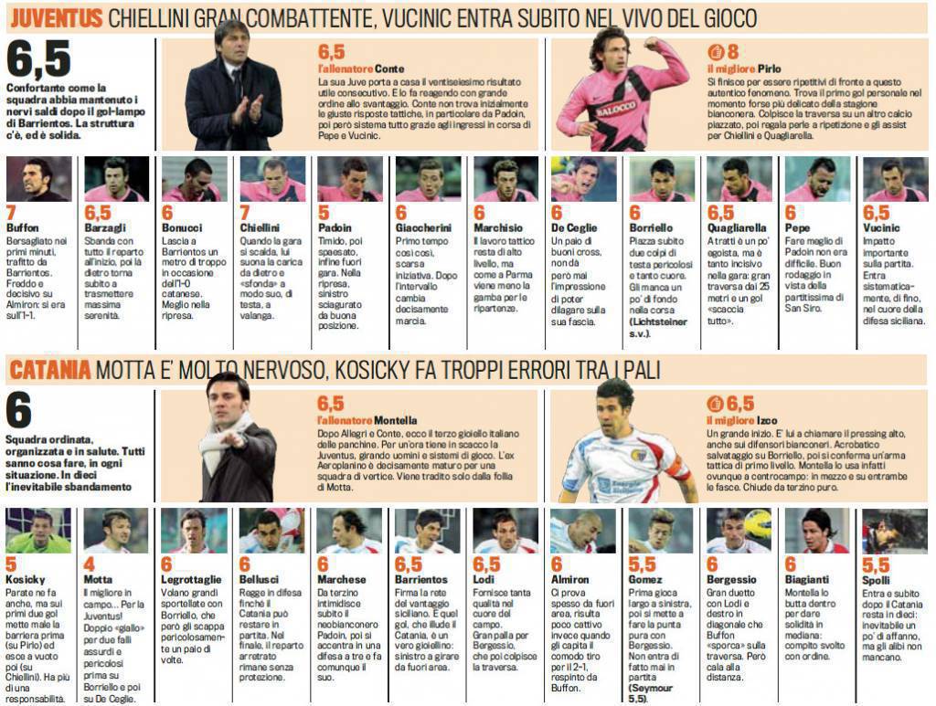 JUVENTUS CATANIA VOTI PAGELLE GAZZETTA – Di seguito potete trovare i voti e le pagelle di Juventus-Catania firmati Gazzetta dello Sport, gara giocatasi allo Juventus Stadium ieri sera e conclusasi con il risultato di 3 a 1 in favore dei bianconeri. Straordinaria prova di Andrea Pirlo, autore di un pregevole gol su punizione nonchè dei due assist per Chiellini e Quagliarella. Ennesima grande prestazione anche di Gigi Buffon, decisivo in diverse occasioni. Fra le fila del Catania il migliore è izco, ovunque a centrocampo, dal centro alle fasce.