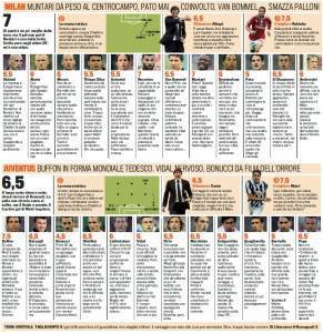MILAN JUVENTUS VOTI PAGELLE GAZZETTA – Di seguito potete trovare i voti e le pagelle de La Gazzetta dello Sport relativi al match Milan-Juventus, gara giocatasi ieri sera allo stadio San Siro e conclusasi, non senza polemiche, con il risultato di parità, 1 a 1. Migliore dell’incontro è Robinho, una vera spina nel fianco per la retroguardia rossonera. Il brasiliano non segna ma si rende spesso pericoloso. Bene anche Muntari (che avrebbe segnato il secondo gol su due gare) nonchè il solito Nocerino, l’autore della rete rossonera. Miglior bianconero, invece, Alessandro Matri, che ha segnato il gol del pareggio.