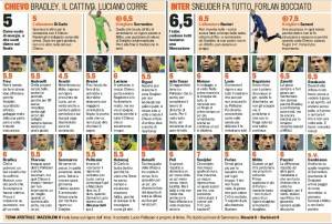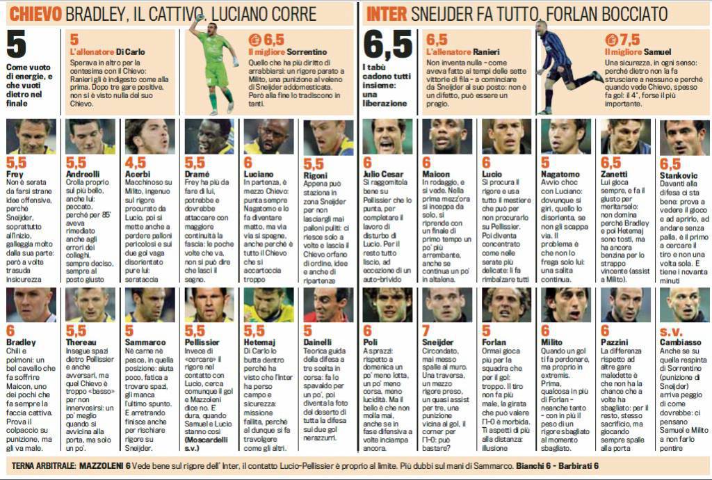 CHIEVO INTER VOTI PAGELLE – Di seguito potete trovare i voti e le pagelle della Gazzetta dello Sport relativi a Chievo-Inter, gara che si è giocata ieri sera allo stadio Bentegodi di Verona e che si è conclusa con il risultato di 2 a 0 in favore dei veneti. I nerazzurri tornano così alla vittoria dopo moltissimi giorni regalando di fatto la panchina a Claudio Ranieri (commossosi durante il match). Ottima prova di un insuperabile Samuel tra l’altro autore anche di uno dei due gol dell’Inter. Male invece Diego Forlan e Nagatomo.