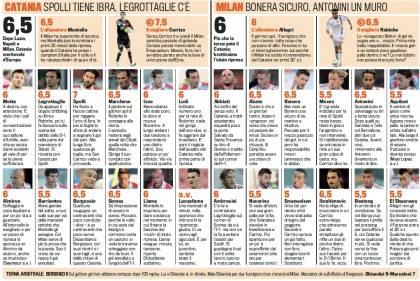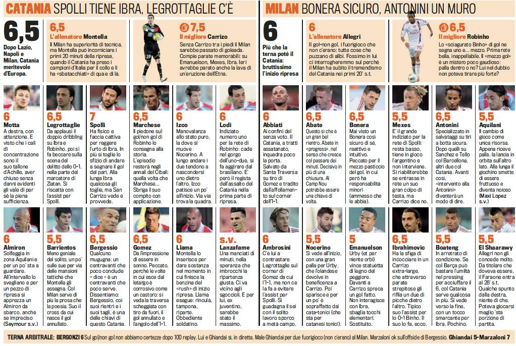 CATANIA MILAN VOTI PAGELLE GAZZETTA – Di seguito trovate i voti e le pagelle firmati Gazzetta dello Sport relativi a Catania-Milan. La gara si è conclusa, non senza polemiche, con il risultato di 1 a 1, in parità. Migliore in campo fra le fila dei rossoneri è stato Robinho autore del gol e di tante buone giocate. Migliore in assoluto risulta però essere l’estremo difensore del Catania, Carrizo, che sventa una serie di tiri molto pericolosi con parate davvero importanti. Male invece Emanuelson così come Boateng non ancora al 100% della forma.