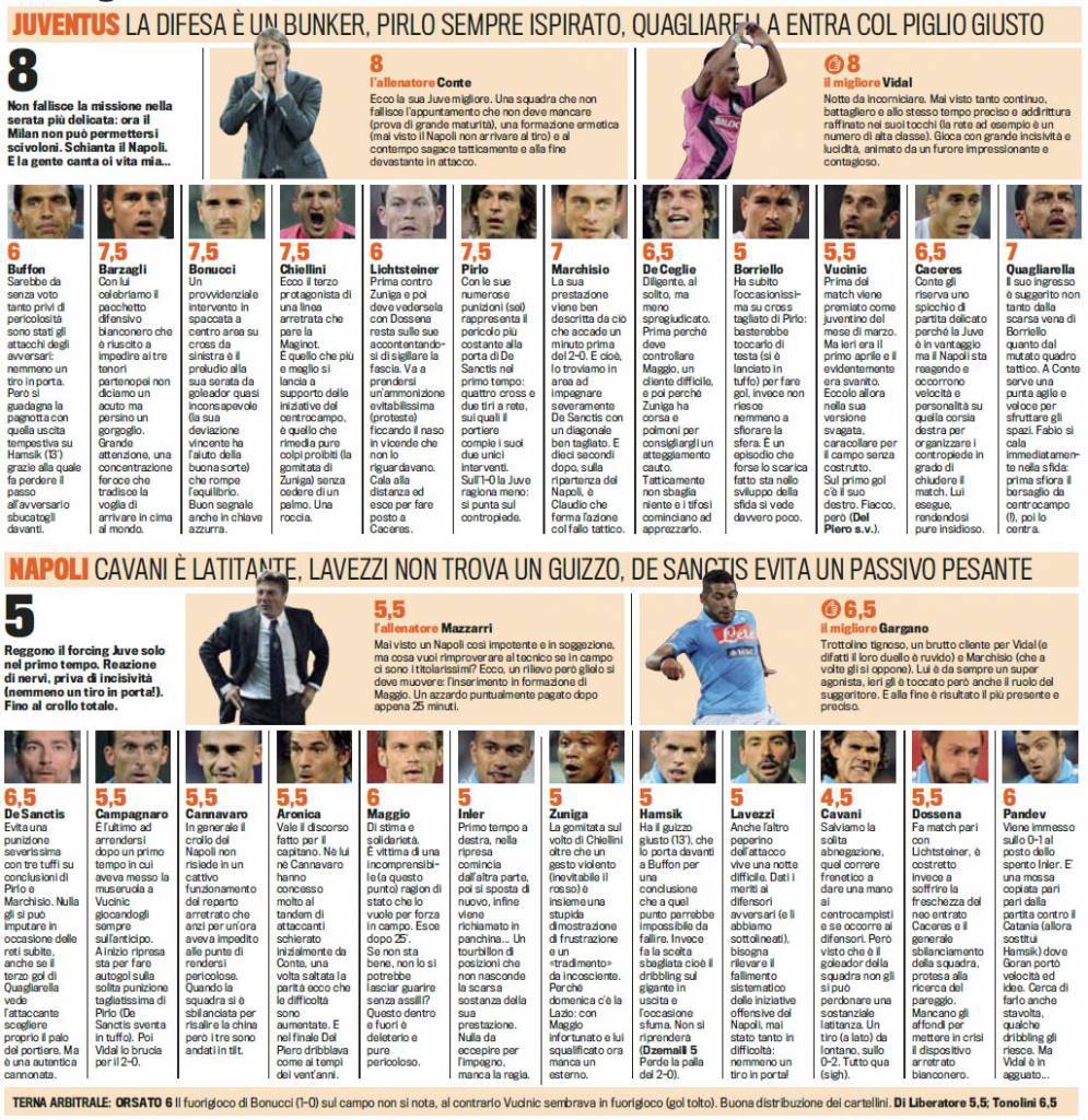 JUVENTUS NAPOLI VOTI PAGELLE GAZZETTA – Di seguito potete trovare i voti e le pagelle di Juventus-Napoli, sfida giocatasi ieri sera allo Juventus Stadium e conclusasi con il risultato di 3 a 0 in favore dei bianconeri. Grandissima prova di Vidal, autore di un gol e di tante grandi giocate, premiato con un bell’ dal quotidiano milanese. Ottima prova anche della retroguardia della Signora, un vero e proprio bunker. In casa Napoli si salva solo Walter Gargano, motorino a centrocampo, mentre male Cavani, praticamente inesistente.