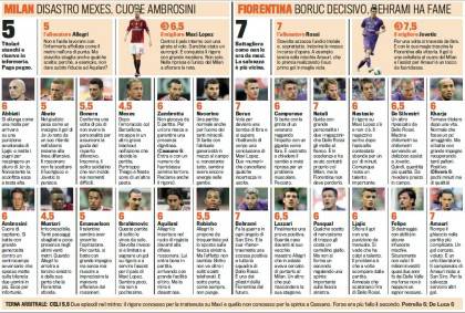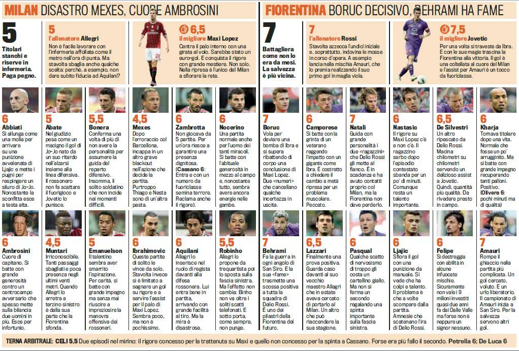 MILAN FIORENTINA VOTI PAGELLE – Potete consultare i voti e le pagelle di Milan-Fiorentina firmati Gazzetta dello Sport. Brutta gara per la banda di Massimiliano Allegri mai incisiva e spesso e volentieri molle e confusionaria. L’unico positivo di casa Milan è Maxi Lopez che prova a fare qualcosa davanti senza però avere troppa fortuna. Prima un palo e poi una grande parata di Boruc negano infatti la gioia del gol all’attaccante argentino. Male Mexes che dopo Barcellona regala un’altra brutta prova favorendo di fatto la rete di Amauri dell’1 a 2 finale dopo strambo colpo di testa.