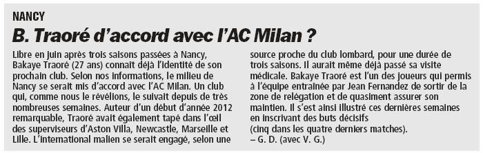 CALCIOMERCATO MILAN. Traorè è praticamente del Milan. E’ questa la bomba sganciata dal noto quotidiano sportivo d’oltralpe, L’Equipe. I francesi riportando l’indiscrezione secondo cui i rossoneri avrebbero fatto sottoscrive un triennale al mediano del Nancy in scadenza di contratto il prossimo 30 giugno del 2012, quindi svincolato. Il nazionale maliano avrebbe addirittura già sostenuto le rituali visite mediche e a questo punto mancherebbe solamente l’ufficialità. Un nuovo colpo a parametro zero per l’ad Galliani che spieriamo si riveli vincente. Di seguito potete trovare l’articolo originale pubblicato quest’oggi, naturalmente, in lingue francese.