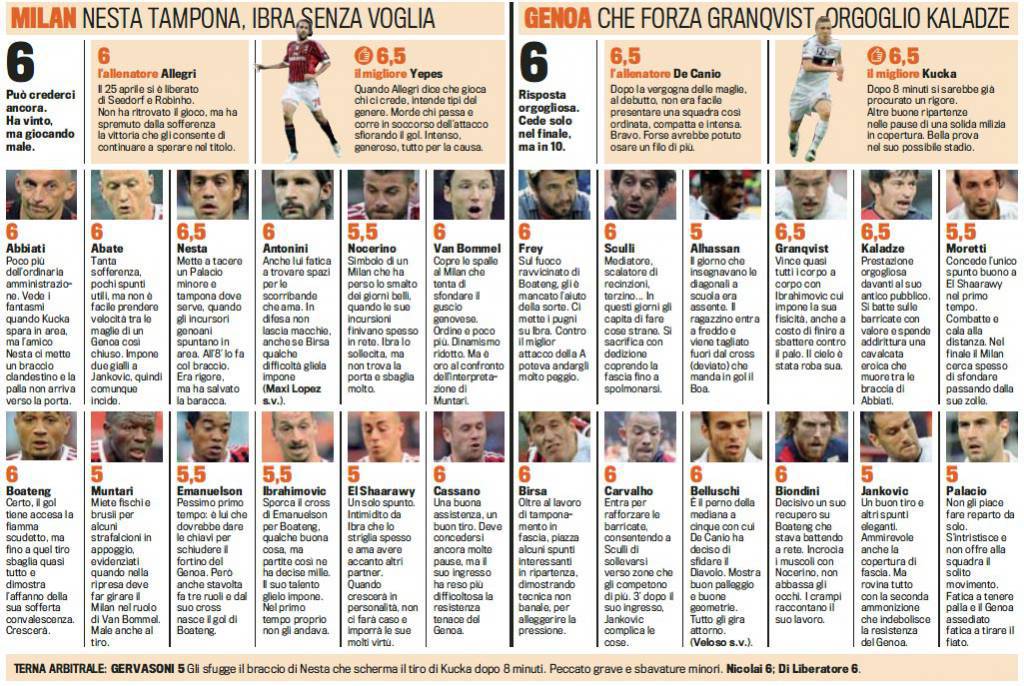MILAN GENOA VOTI PAGELLE – Di seguito potete visionare i voti e le pagelle Gazzetta dello Sport di Milan-Genoa, sfida giocatasi ieri sera a San Siro e conclusasi con il risultato di 1 a 0 in favore dei rossoneri. Migliore in campo in assoluto è Mario Yepes, chiamato a sostituire gli assenti Bonera e Mexes e reduce da un’ottima prova. Bene anche Alessandro Nesta mentre resto della squadra sulla sufficienza o quasi, compreso l’autore del gol, Boateng. Fra le fila del Genoa spicca la prova di Kucka uno dei più pericolosi dei rossoblu.