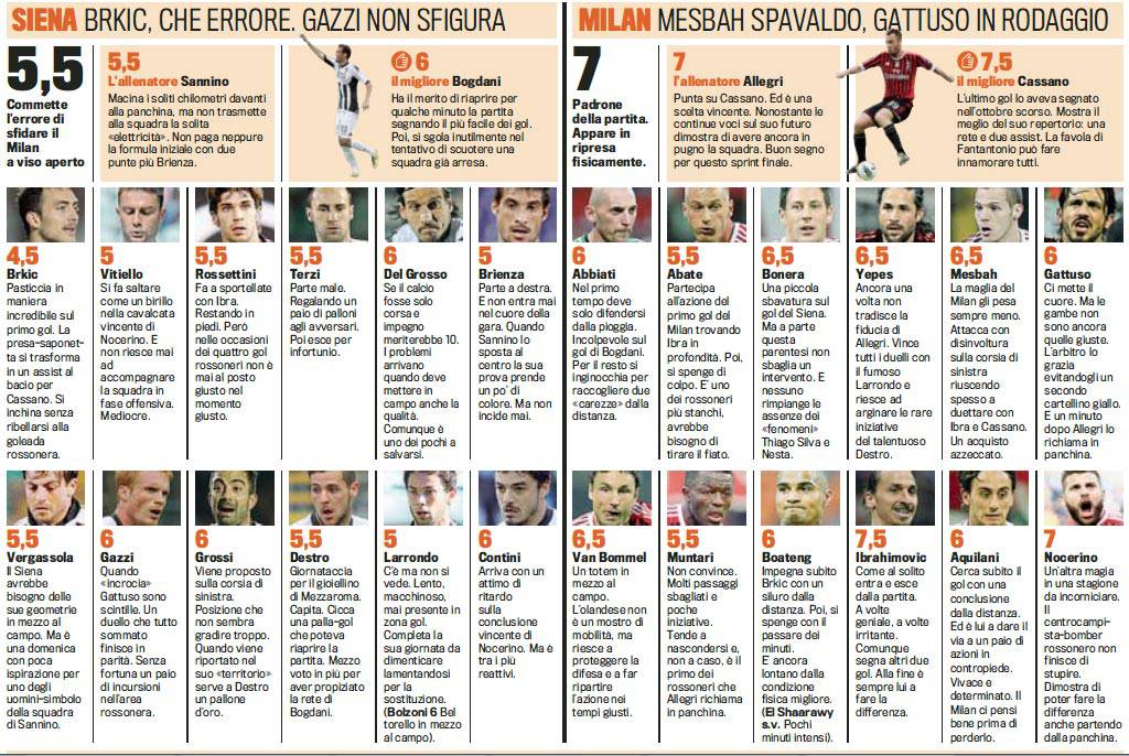 SIENA MILAN VOTI PAGELLE – Di seguito i voti e le pagelle firmati Gazzetta dello Sport di Siena-Milan. Grande prova dei rossoneri che superano i bianconeri con il rotondo risultato di 4 a 1. Sugli scudi Antonio Cassano, tornato titolare dal primo minuto e tornato in gol dopo la paura dello scorso novembre. Per lui, oltre alla rete, anche due assist al bacio che fanno tornare grande il Milan. Spettacolare anche la prova di Ibrahimovic, in gol per due volte, nonchè del solito Nocerino, uno dei simboli dei rossoneri formato 2011-2012.