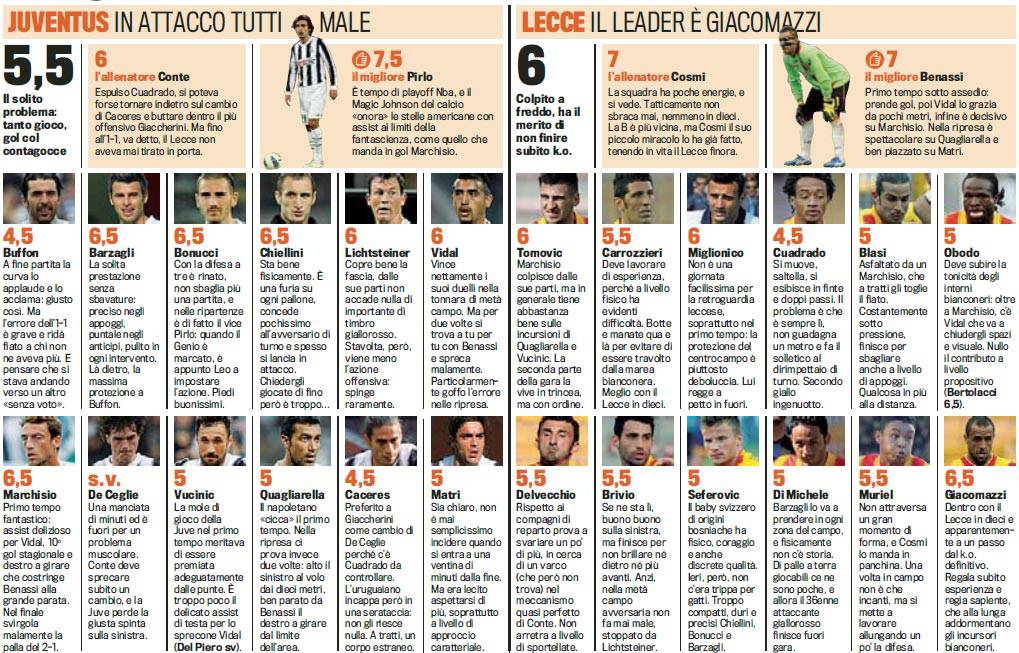 JUVENTUS LECCE VOTI PAGELLE – Più in basso potete consultare i voti e le pagelle Gazzetta dello Sport relativi alla sfida fra Juventus e Lecce, gara giocatasi ieri sera allo Juventus Stadium e conclusasi con il risultato di partità, 1 a 1. Disastroso Buffon che regala inspiegabilmente la palla gol al Lecce e complica inesorabilmente la corsa scudetto della Juventus, che con una vittoria, avrebbe già potuto festeggiare il tricolore nel weekend. Prova sublime di Andrea Pirlo, letteralmente magico, come dimostra nell’assist per Marchisio all’ottavo minuto di gioco.