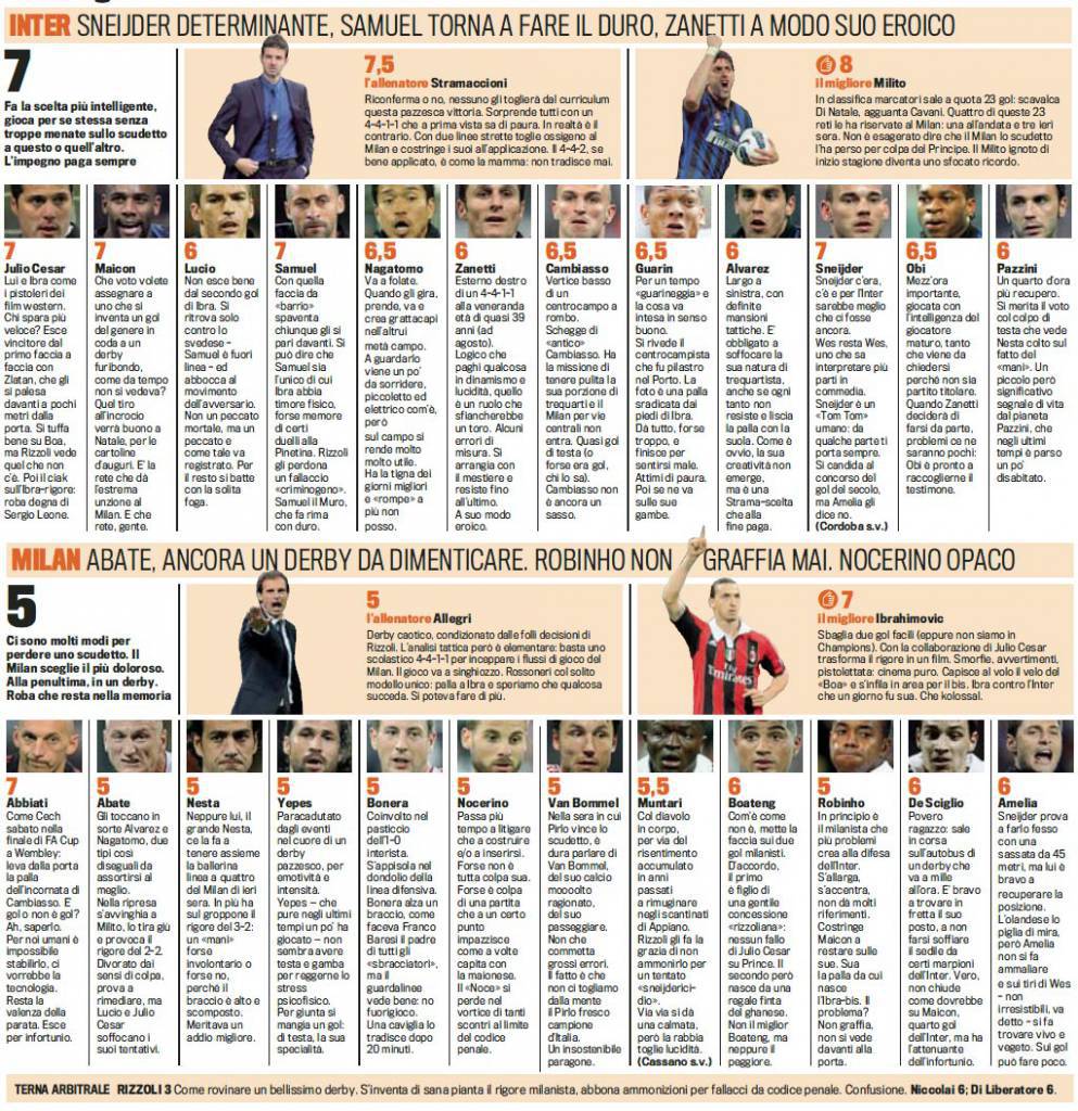 INTER MILAN VOTI PAGELLE – Di seguito potete trovare i voti e le pagelle firmati Gazzetta dello Sport della sfida Inter-Milan, gara giocatasi ieri sera allo stadio San Siro e conclusasi con il risultato di 4 a 2 in favore dei nerazzurri. Brutta prova del Milan forse distratto dalle notizie negative che arrivavano in contemporanea da Trieste. Ci prova solo Ibrahimovic a tenere a galla la squadra e lo svedese realizza prima un gol dal dischetto e poi segna il momentaneo vantaggio ad inizio ripresa. Ottima prova anche di Abbiati, spesso decisivo, mentre resto della formazione attorno al 5/6.