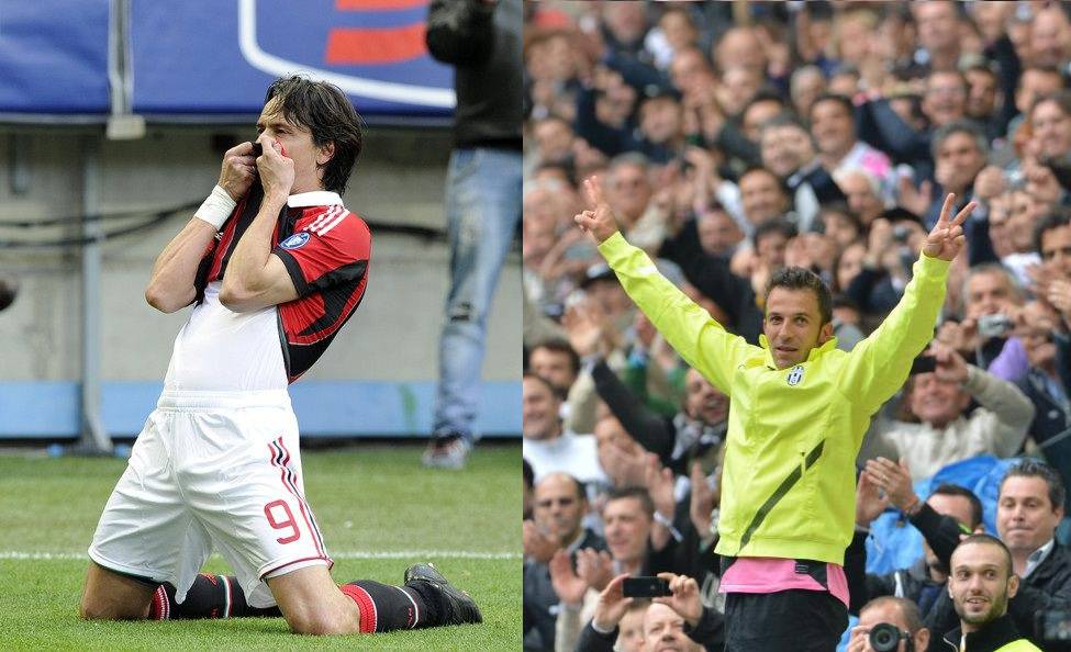 Per Del Piero l’approdo ad una grande squadra arriva già nel ’93, anno in cui firma il contratto con la Juventus di cui diventerà capitano nel 2001. Per Inzaghi la prima vera svolta arriva qualche anno più tardi, precisamente nel ’97 quando arriva la chiamata proprio della Juve di Del Piero con cui stringe una grande amicizia sia in campo che fuori che lo porterà a firmare con la maglia bianconera ben 89 gol in 165 presenze. Del Piero in quegli anni comincia ad affermarsi in una squadra già ricca di campioni che nel ’96 aveva conquistato la Champions League, guadagnandosi a suon di grandi giocate e fantastici gol la titolarità fissa e portando la Juve alla decisione clamorosa di cedere Baggio per puntare tutto proprio su Del Piero. Nel 2002, dopo le sofferenze dell’infortunio patito 3 anni prima, conquista il suo primo scudetto da capitano. E’ la juve del Lippi-bis che l’anno dopo arriva in finale di Champions persa ai rigori contro il Milan a Manchester, lotteria che vede comunque Del Piero andare in gol. Di li a poco sarebbe iniziato per Del Piero e la sua Juventus un periodo piuttosto nero dovuto al caso Calciopoli scoppiato nell’estate del 2006 dal quale comunque la società bianconera, retrocessa in B, seppe rialzarsi riconquistando subito la Serie A che vinceranno 5 anni dopo. Del Piero con la maglia della Juventus ha firmato 290 gol in 704 presenze. Numeri impressionanti che lasciano tanta nostalgia nel cuore dei tifosi bianconeri che vedono finire la sua carriera con la “Vecchia signora” proprio nell’anno della gioia più grande, l’anno della riconquista dello scudetto.