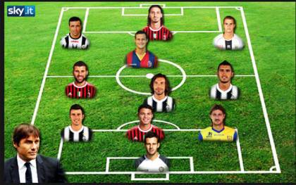 TOP 11 SERIE A – La redazione di Sky Sport, in concomitanza con la conclusione della stagione di Serie A, ha stilato la top 11, i migliori calciatori del campionato che ieri sera ha chiuso i battenti. Figurano anche tre rossoneri e precisamente il capocannoniere Zlatan Ibrahimovic, la rivelazione Antonio Nocerino, e il centrale di difesa Thiago Silva. Tre rossoneri ma anche tre juventini e precisamente Andrea Barzagli, l’ex Milan Pirlo, e Vidal. Completano lo scacchiere i due “friulani” Di Natale e Handanovic, Francesco Acerbi del Chievo, Sebastian Giovinco del Parma e Diamanti, scelto dalla redazione di Sky come trequartista. In panca, infine, si accomoda il bianconero Conte.