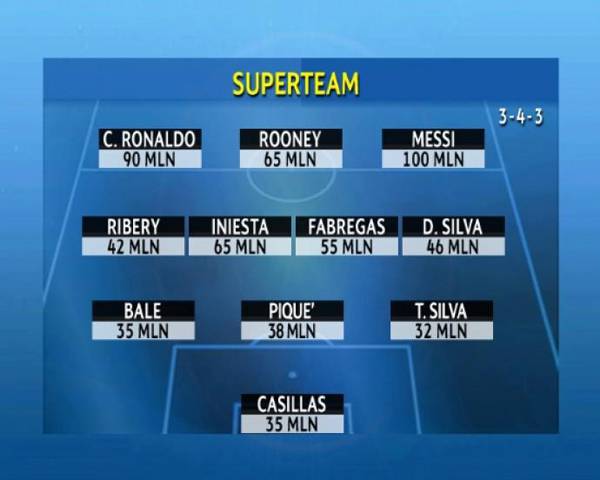 CALCIOMERCATO – Un gruppo di analisti ha deciso di realizzare una sorta di gioco, ovvero, mettere insieme gli 11 giocatori attualmente più cari al mondo, in base a delle precise stime di mercato. Una formazione dal valore totale di ben 603 milioni di euro (per capirci meglio l’intero Milan ne vale 800), composta da giocatori del calibro di Cristiano Ronaldo, Messi (sottostimato a 100 milioni di euro), il rossonero Thiago Silva, ma anche Ribery, David Silva, Rooney ed altri ancora: cosa ne pensate di questa superformazione?