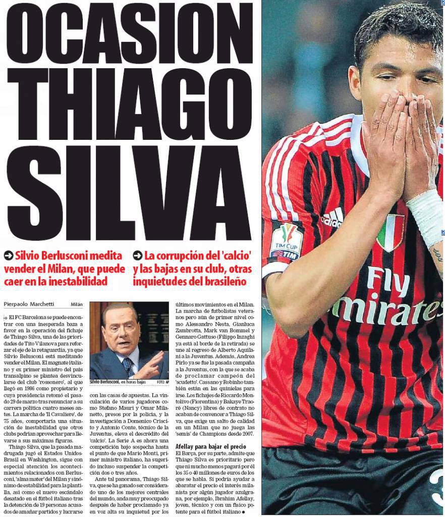 CALCIOMERCATO MILAN – Di seguito l’articolo completo pubblicato quest’oggi dall’edizione de El Mundo Deportivo, noto quotidiano catalana. In Spagna continuano ad accostare il nome del centrale brasiliano del Milan e della nazionale, Thiago Silva, primo obiettivo dopo la riunione di mercato degli scorsi giorni fra l’allenatore dei catalani, Villanova, e il dirigente sportivo blaugrana Zubizzarreta. L’articolo è naturalmente in lingua originale, spagnola, ma il senso di tutta la questione è relativamente semplice: il Barcellona vuole Thiago Silva, resisterà l’ad Galliani a questi continui assalti?