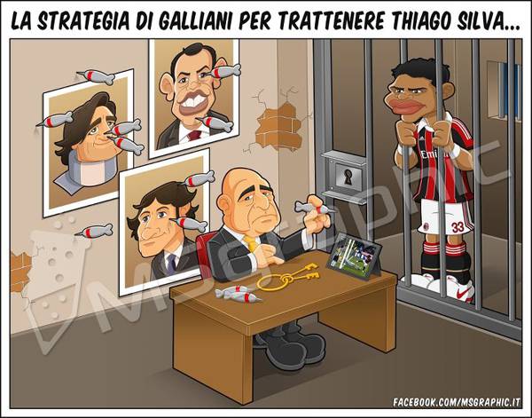 THIAGO SILVA GALLIANI – Pubblichiamo ormai come di consueto un divertente sfottò pubblicato nelle ultime ore sul noto social network Facebook. Argomento dell’ironia è il futuro di Thiago Silva, difensore centrale del Milan e della nazionale brasiliana sempre più desiderato dalle big del Vecchio Continente con Paris Saint Germain e Barcellona in cima alla lista. Qualcuno su Facebook propone una nuova strategia all’ad Galliani per riuscire a trattenere il giocatore a Milano ed ha deciso di realizzare una vignetta a riguardo che trovate più in basso…