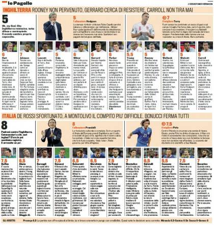 ITALIA INGHILTERRA VOTI PAGELLE – Di seguito potete trovare i voti e le pagelle di Italia-Inghilterra firmati Gazzetta dello Sport. Grande prova di Andrea Pirlo, giudicato il migliore in campo dalla Rosa. Molto bene anche Riccardo Montolivo, alla prima da titolare, e decisamente più incisivo rispetto a Thiago Motta. Fra i rossoneri in campo malino Cassano, un po’ spento ad eccezione di un paio di colpi, mentre grande prova di Nocerino, subentrato nella ripresa, pericoloso con una grande occasione, e capace di trasformare il rigore nella roulette finale.