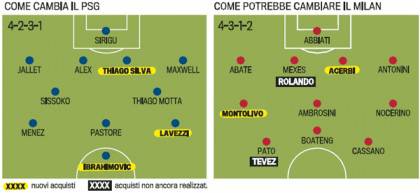CALCIOMERCATO MILAN – Con la partenza ormai prossima di Thiago Silva e di Zlatan Ibrahimovic inizia ufficialmente il calciomercato estivo del Milan. L’ad Galliani si sta subito dando da fare per individuare giocatori all’altezza dei due partenti. Per l’attacco il nome più gettonato è quello di Tevez con l’alternativa Dzeko e un Destro sullo sfondo. In difesa, invece, piace moltissimo Rolando del Porto, anche se non sono da escludere tentativi per Ogbonna e Astori. Un 11 2012-2013 che dovrebbe essere il seguente MILAN (4-3-1-2) Abbiati, Abate, Mexes/Rolando, Acerbi, Antonini, Montolivo, Ambrosini, Nocerino, Tevez (Pato), Boateng, Cassano. Non è da escludere anche l’arrivo di un terzino sinistro nonchè un nuovo centrocampista centrale, con i vari Diarra e Sahin nel mirino. Di seguito la foto pubblicata da La Gazzetta dello Sport con il nuovo PSG e il nuovo Milan.