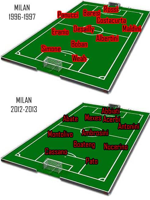 MILAN – Sono delusi i tifosi del Milan dopo la doppia partenza shock di Ibrahimovic e Thiago Silva, che si aggiunge ai vari addii dei senatori, oltre che per via di un futuro che si preannuncia di magra. Soldi non ce ne sono e in via Turati si sta cercando qualche occasione low cost con la speranza di un colpo di fino agosto. Fino ad oggi però è un mercato davvero scarno dei vice campioni d’Italia. Fra i supporters più drastici c’è chi pensa che la squadra che l’anno prossimo scenderà in campo sia una delle peggiori, se non quella peggiore in assoluto, dell’era Berlusconi. La redazione di Milanlive.it ha voluto realizzare una sorta di gioco, mettendo in contrapposizione quello che, numeri alla mano, è la squadra peggiore da 26 anni a questa parte, quella targata 1996-1997, che concluse il campionato con un eloquente 11esimo posto, appunto al Milan 2012-2013. Naturalmente siamo al 20 luglio e alla fine del mercato mancano ancora 40 giorni e tutto può succedere…
