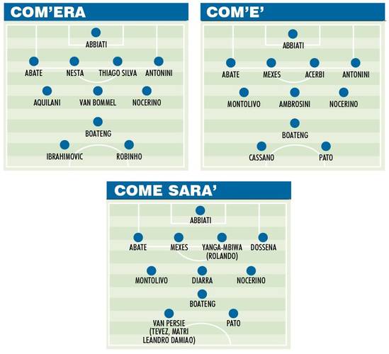 CALCIOMERCATO MILAN – Tre acquisti, uno per ogni reparto. Sono queste le richieste dell’allenatore del Milan, Massimiliano Allegri, esternate ieri pomeriggio in un’intervista a Sky Sport. Il tecnico livornese chiede quindi nuovi arrivi alla propria dirigenza e Il Corriere dello Sport ha cercato di ipotizzare quali potrebbero essere i volti nuovi che popoleranno Milanello fra qualche settimana. Si parte dalla fascia sinistra della difesa dove ci sarà Dossena al posto di Antonini. L’erede di Thiago Silva sarà invece Rolando del Porto o la new entry del Montpellier Yanga-Mbiwa. A centrocampo, in cabina di regia, spazio a Diarra e infine l’attacco, dove, al fianco di Pato, potrebbe stazione uno a scelta fra il sogno Van Persie, Tevez, Damiao, Dzekoo Matri.
