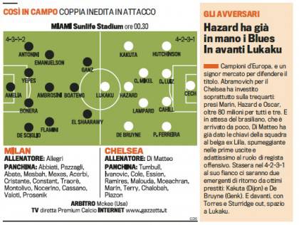 MILAN CHELSEA PROBABILI FORMAZIONI – Di seguito potete consultare le probabili formazioni di Milan-Chelsea, match amichevole che si giocherà questa notte alle ore 00.30, allo stadio di Miami. I rossoneri, rimaneggiati, sfidano i londinesi con in campo i due giovani prodotti della Primavera De Sciglio e Ganz. A fianco di quest’ultimo, in attacco, stazionerà El Shaarawy, supportato alle spalle da Boateng. Centrocampo con Ambrosini in cabina di regia, Flamini ed Emanuelson sugli interni. Infine, completano l’11 titolare, Antonini, Bonera, Yepes e Amelia.