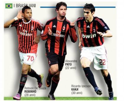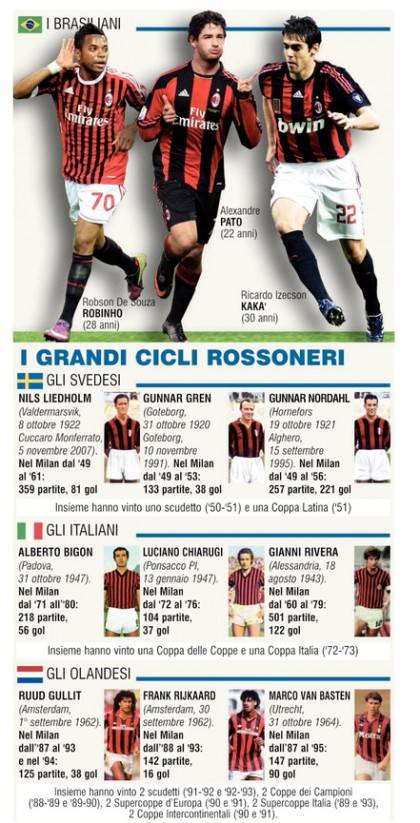 CALCIOMERCATO MILAN – Potrebbe nascere a breve il quarto ciclo di casa Milan, quello tutto brasiliano e formato dal trio di campionissimi Robinho, Pato e Kakà. L’ad Galliani si trova attualmente negli Stati Uniti dove sta provando a chiudere l’operazione “ritorno figliol prodigo” con il Real, tutt’altro che semplice, ma il plenipotenziario di via Turati vuole tentare fino all’ultimo Un Milan brasiliano che verrebbe dopo il Milan degli svedesi negli anni ’50, quello degli italiani, negli anni ’70, e infine quello, storico, degli olandesi, a cavallo fra l’80 e il ’90. Di seguito la foto del Corriere dello Sport con i 4 cicli del Milan: qual è il più forte?