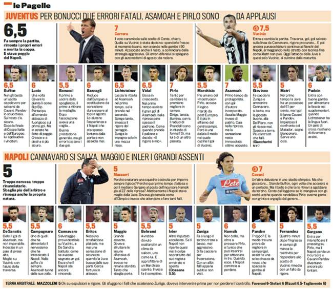 JUVENTUS NAPOLI VOTI E PAGELLE – Di seguito potete consultare i voti e le pagelle firmati Gazzetta dello Sport relativi alla sfida fra Juventus e Napoli, Supercoppa Italiana giocatasi ieri pomeriggio e vinta dai bianconeri con il risultato di 4 a 2. Una gara che ha visto protagonista assoluto Mirko Vucinic, autore di un match straordinario e premiato dalla Rosa con un bel 7,5. Molto bene anche uno dei tanti nuovi acquisti, Asamoah, così come la sicurezza Andrea Pirlo. Nel Napoli si salva il solo Cavani, nonchè Hamsik, Cannavaro e Pandev, gli unici sufficienti.