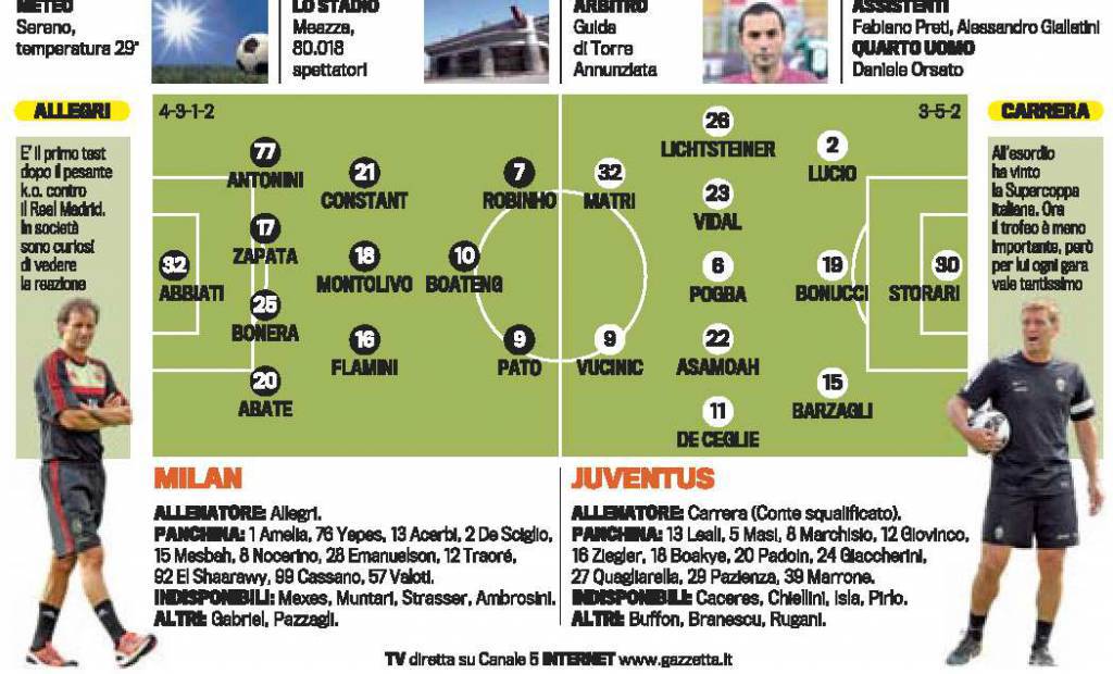 TROFEO BERLUSCONI MILAN JUVENTUS FORMAZIONI MATCH – Ultimo importantissimo test per gli uomini Massimiliano Allegri che questa sera, al Giuseppe Meazza di San Siro, Milano, affronteranno la Juventus campione d’Italia per il consueto trofeo “Luigi Berlusconi”. Montolivo in cabina di regia, Zapata titolare dal primo minuto e Cassano in panchina prima del fischio finale, le principali novità che vi riportiamo grazie alle formazioni riportate stamani dalla Gazzetta dello Sport. Grande assente nelle fila della Juventus, Andrea Pirlo, ex di turno della partita.