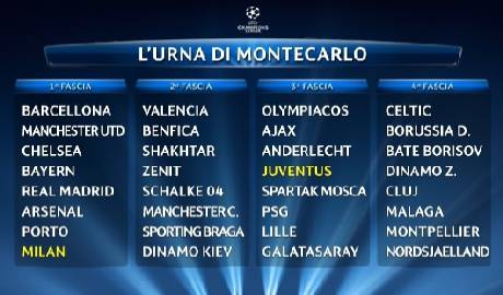 Milan News Champions League- Oltre all’inizio dei principali campionati europei, la gente attende durante tutta l’estate anche il sorteggio della Champions League. Dal 1990 nessuno riesce a vincere la Coppa per due anni di fila (ultimo fu proprio il Milan di Sacchi). Il Chelsea di Di Matteo riuscirà dunque a confermarsi? O le rivali principali (Real Madrid, Barcellona, Manchester City, Psg, Manchester United, Bayern Monaco, Borussia Dortmud, Milan e Juve) elimineranno i blues conquistando il trofeo più ambito? Questa sera a Montecarlo, con i sorteggi dei gironi, parte ufficialmente la Champions 2012-2013: quest’anno rischiano tutte, comprese le squadre di prima fascia. Fra le “seconde” spicca infatti il City di Mancini, mentre il terza fascia c’è il Psg di Ibrahimovic. Perfino la quarta fascia propone un cliente scomodo come il Dortmund di Klopp, da due anni dominatore assoluto in Germania. Per la Juventus, inserita in terza fascia, le possibilità di un girone di ferro sono altissime: i bianconeri potrebbero finire nello stesso gruppo di Real Madrid (o Barcellona) Manchester City e Borussia Dortmund. Anche il Milan, pur essendo testa di serie, assisterà ai sorteggi con qualche preoccupazione: se è vero che un sorteggio particolarmente fortunato abbinerebbe i rossoneri a Braga, Anderlecht e Nordsjaelland, con un po’ di sfortuna si potrebbero incontrare invece City, Psg e Dortmund. Che la fortuna sia con le italiane dunque…