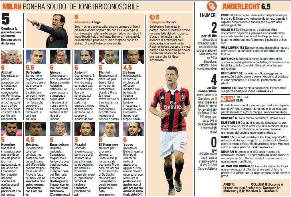 MILAN ANDERLECHT VOTI PAGELLE – Nuovo mezzo passo falso del Milan che in casa, contro l’Anderlecht, alla prima di Champions League, non va oltre lo 0 a 0. Una prestazione deludente soprattutto di Kevin Prince Boateng, ormai l’ombra di se stesso, nonchè di Nigel De Jong, uno dei tanti volti nuovi di questo Milan “sperimentale”, lento ed impacciato. Si salva Bonera (voto 6), che ripete di fatto la prestazione di sabato sera, senza eccessive sbavature. Bene anche El Shaarawy, che ha sfiorato il gol di testa nonchè Emanuelson, uno dei più frizzanti in attacco. Di seguito i voti e le pagelle firmati Gazzetta dello Sport.