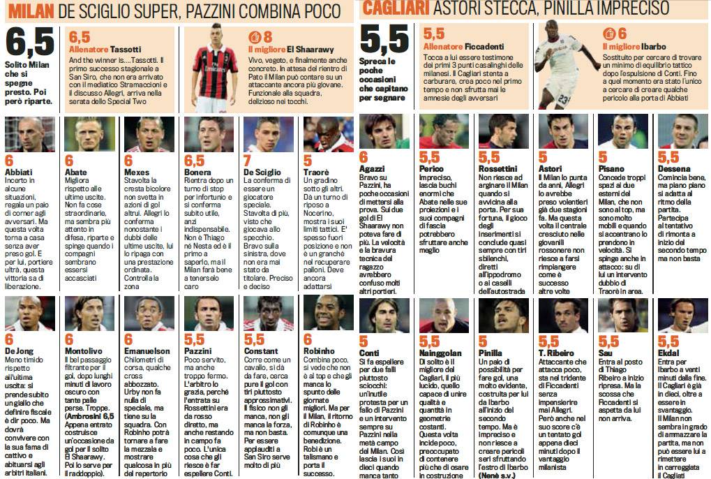 MILAN CAGLIARI VOTI PAGELLE GAZZETTA – Di seguito potete visionare i voti firmati da La Gazzetta dello Sport di Milan-Cagliari, gara giocatasi ieri sera allo stadio San Siro e conclusasi con il risultato di 2 a 0 in favore dei rossoneri. Straordinaria prestazione di El Shaarawy che dopo aver segnato in Friuli si ripete e realizza una magica doppietta. Sottotono ancora Nigel De Jong, solo sei in pagella per lui, mentre appare ancora spaesato Traorè, alla prima da titolare ieri sera. Altra nota positiva quella relativa a De Sciglio (voto 7): il Milan ha trovato il terzino del futuro!