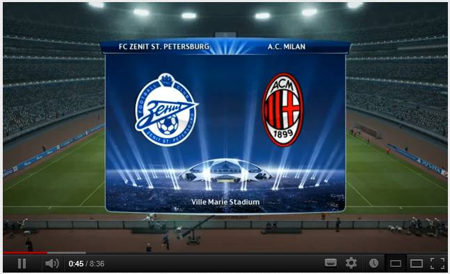 VIDEO PES 2013 ZENIT-MILAN – Tornano le simulazioni a Pro Evolution Soccer 2013. In vista della sfida di questa sera fra il Milan e lo Zenit di San Pietroburgo, in programma in Russia a partire dalle ore 18.00, abbiamo scovato sul web un’interessata simulazione videoludica del match in questione. Questa sera inutile ricordare che Massimiliano Allegri si gioca una fetta della propria permanenza. Inizia infatti una quattro giorni di fuoco per il tecnico livornese che si concluderà soltanto domenica sera con il derby contro l’Inter. Nel frattempo godiamoci il video di PES…