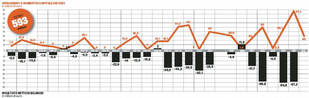CALCIOMERCATO MILAN – Interessante inchiesta pubblicata stamane da La Gazzetta dello Sport. Il quotidiano rosa ha riportato le spese dei principali presidenti italiani di calcio comprese naturalmente quelle del patron rossonero Silvio Berlusconi. Dal 1986, anno in cui si è assicurato il Milan, ad oggi, il manager meneghino ha investito ben 593 milioni di euro, con un picco massimo di 87 milioni i nel 2011. Profitti si sono registrati solo tre volte: nel 1990-91, nel 1999-2000 e nel 2006 (quando fu ceduto Shevchenko). La quarta volta potrebbe capitare quest’anno vista la doppia partenza di Thiago Silva e Ibrahimovic e i tagli netti dei vari ingaggio. Un dato che si allarga a dismisura se si prendono in considerazione anche gli investimenti effettuati negli ultimi anni dai vari Moratti, Agnelli, Zamparini, Pozzo e via discorrendo, arrivando alla cifra incredibile di 2,5 miliardi di euro!