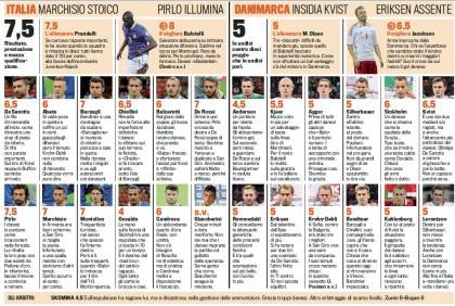 ITALIA DANIMARCA VOTI PAGELLE GAZZETTA – Di seguito potete consultare i voti e le pagelle di Italia Danimarca firmati Gazzetta dello Sport. Migliore in campo in assoluto è Super Mario Balotelli, autore di una prestazione caratterizzata da un gol ma soprattutto da tante grandi giocate. Molto bene anche il solito Andrea Pirlo protagonista del match con due assist al bacio. Fra i migliori anche Riccardo Montolivo, centrocampista rossonero, in rete con un gran destro da fuori area: un’ottima prova per l’ex Viola in vista della sfida con la Lazio.