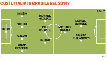 ITALIA MONDIALI 2014 – Sta nascendo a poco a poco in questi mesi l’Italia che prenderà parte ai prossimi Mondiali, quelli che si terranno in Brasile fra meno di due anni, nel 2014. La Gazzetta dello Sport ha cercato di ipotizzare quali potrebbero essere gli 11 azzurri titolari della manifestazione. Confermata la presenza del nocciolo duro del gruppo con i vari Buffon, Chiellini, Barzagli, Pirlo e De Rossi. Le novità più interessanti riguardano i due rossoneri De Sciglio (attualmente Under-21), che potrebbe ricoprire un ruolo importante sulla corsia destra, nonchè El Shaarawy, già nazionale maggiore ma scalpitante e in cerca di spazio. Attenzione anche al futuro del gioiello giallorosso Florenzi nonchè ai vari Insigne e Verratti.