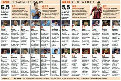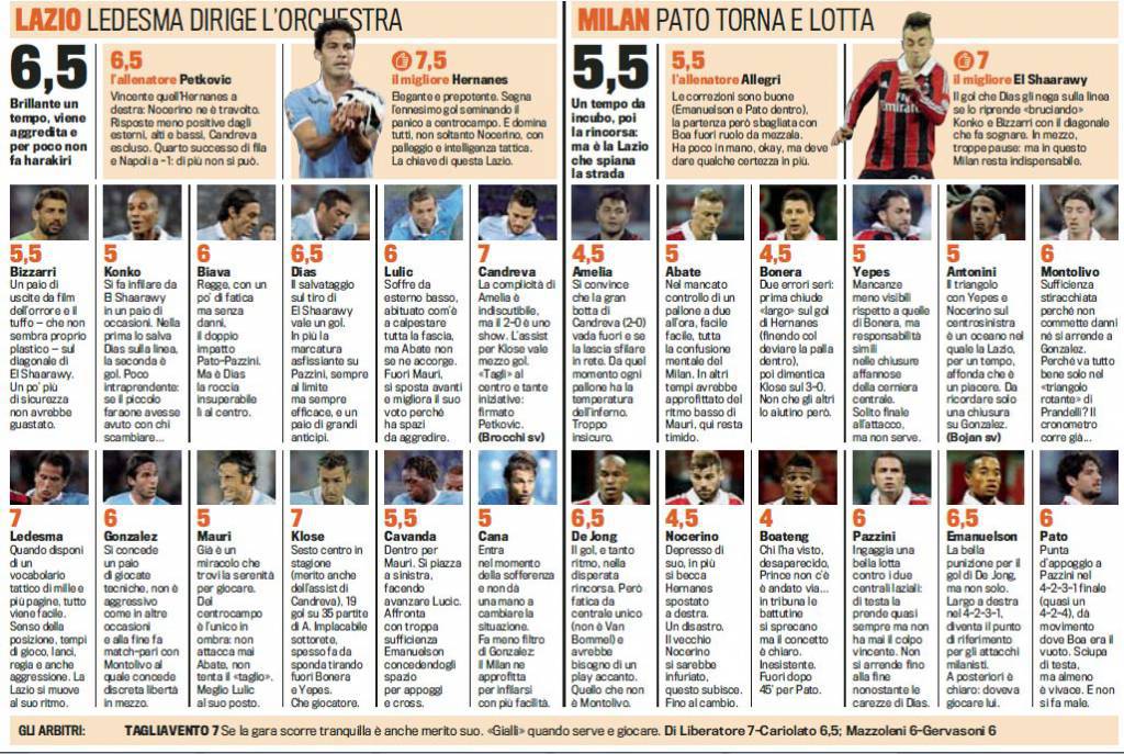 LAZIO MILAN VOTI PAGELLE GAZZETTA DELLO SPORT – Di seguito potrete visionare i voti e le pagelle Gazzetta dello Sport relativamente alla partita giocatasi ieri sera allo stadio Olimpico di Roma fra la Lazio e il Milan. La gara si è conclusa con il risultato di 3 a 2 in favore della Lazio. Ennesima grande prova di Stephan El Shaarawy, ancora in gol ieri sera, mentre nuova disarmante prestazione di Kevin Prince Boateng (voto 4). Fra le fila dei rossoneri si salvano anche De Jong ed Emanuelson mentre per Pato, entrato nella ripresa, voto 6.