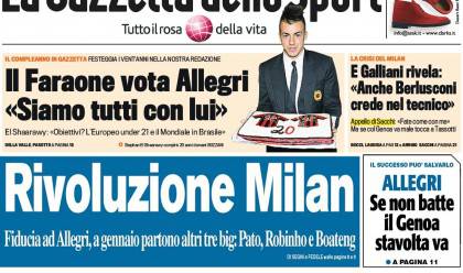 RASSEGNA STAMPA MILAN FOTO – Di seguito potete trovare i principali titoli dei tre quotidiani sportivi, La Gazzetta dello Sport, Corriere dello Sport e Tuttosport, riguardanti naturalmente il nostro Milan. Importante il titolo del Corriere dello Sport che parla di vera e propria rivoluzione Milan in vista delle prossime finestre di trattative con la partenza di tre giocatori importanti. Su Tuttosport si sottolinea invece come il prossimo match sarà l’ultimo per Allegri in caso di sconfitta. Infine su La Gazzetta dello Sport vengono riportate le parole di El Shaarawy che crede ancora nel mister livornese.