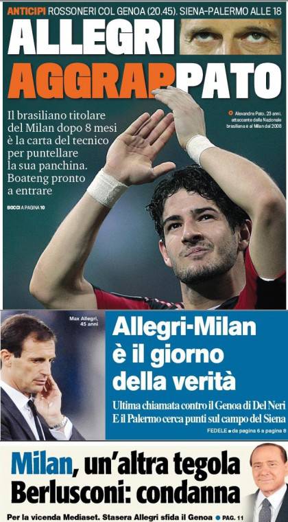 RASSEGNA STAMPA MILAN FOTO – Di seguito potete trovare i principali titoli dei tre quotidiani sportivi, La Gazzetta dello Sport, Corriere dello Sport e Tuttosport, riguardanti naturalmente il nostro Milan. La Gazzetta dello Sport si concentra su Pato, l’ultimo scoglio di Allegri per cercare di tornare a vincere e rimanere ancorato alla panchina rossonera. Tuttosport sottolinea invece la condanna al presidente Berlusconi mentre il Corriere dello Sport parla di ultimo esame per il tecnico del Milan. Ecco di seguito i tre titoloni principali